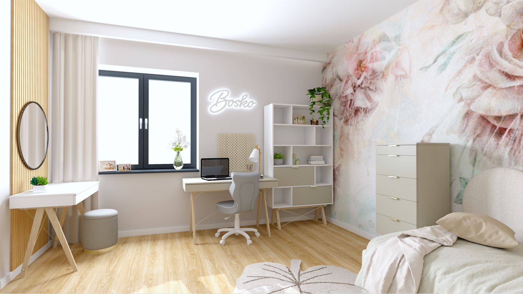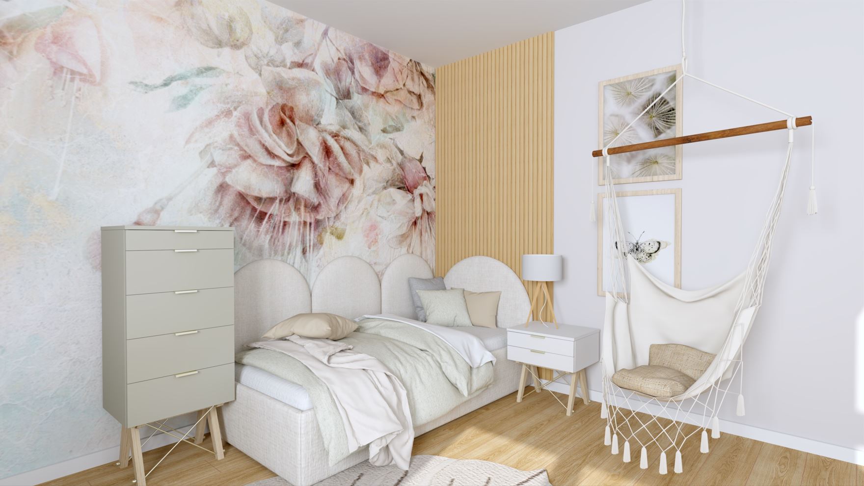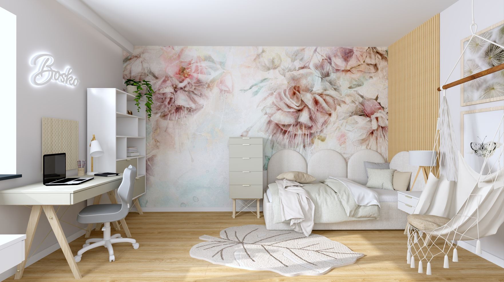 Boho, Entelo, Kwiaty, Ledon, Linerio, Minko, Panele tapicerowane, Pokój dla nastolatki, Pokój w stylu boho, Tapeta malumi