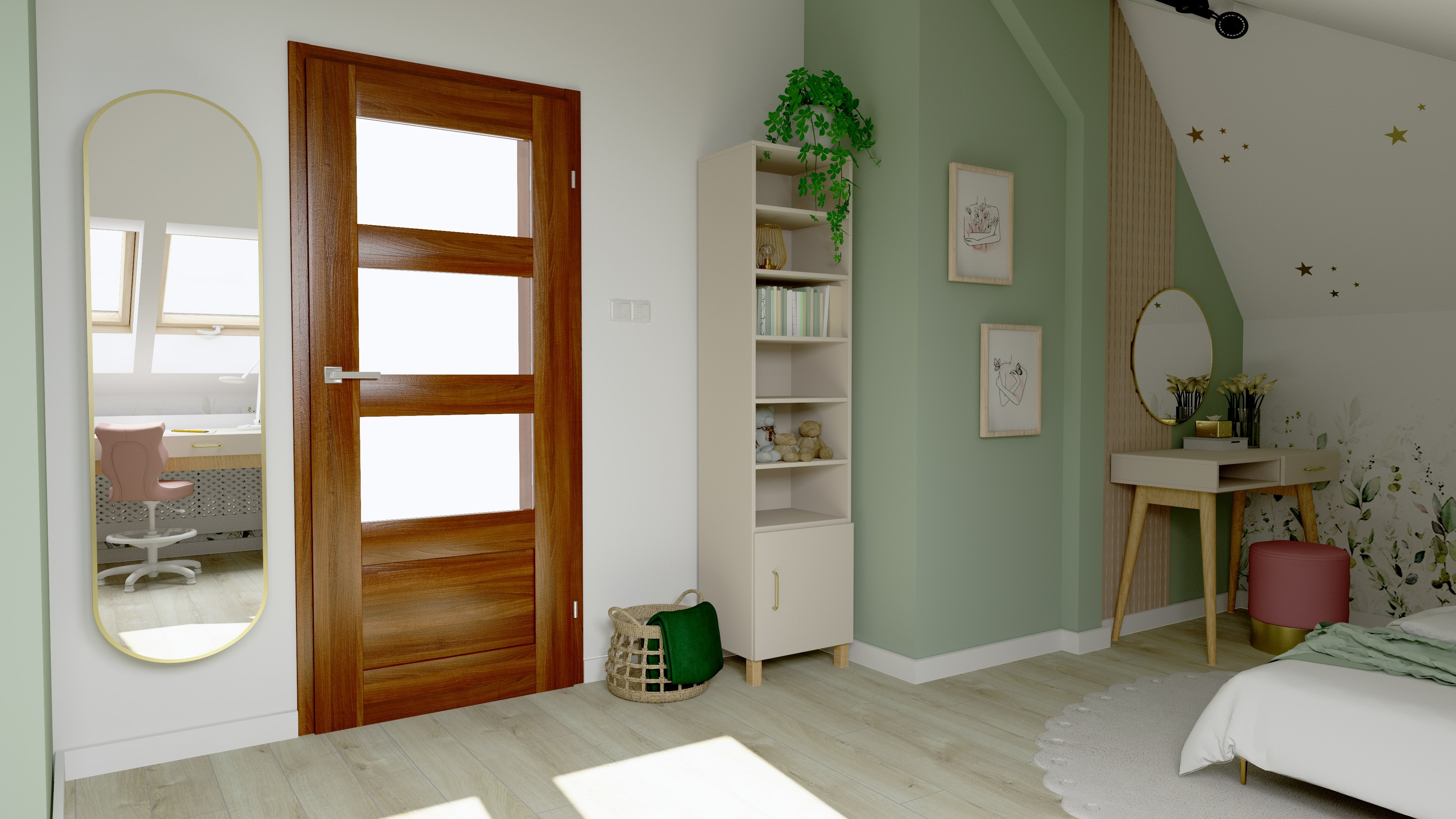 Ten projekt pokoju dziecięcego został zaprojektowany z myślą o dziewczynce w wieku wczesnoszkolnym (ok. 6 lat), która potrzebuje wnętrza zarówno do zabawy, odpoczynku, jak i nauki. Zielono-różowa paleta barw oraz starannie dobrane elementy wyposażenia sprawiają, że pokój Jagody jest przestrzenią uniwersalną, piękną i funkcjonalną zarazem.