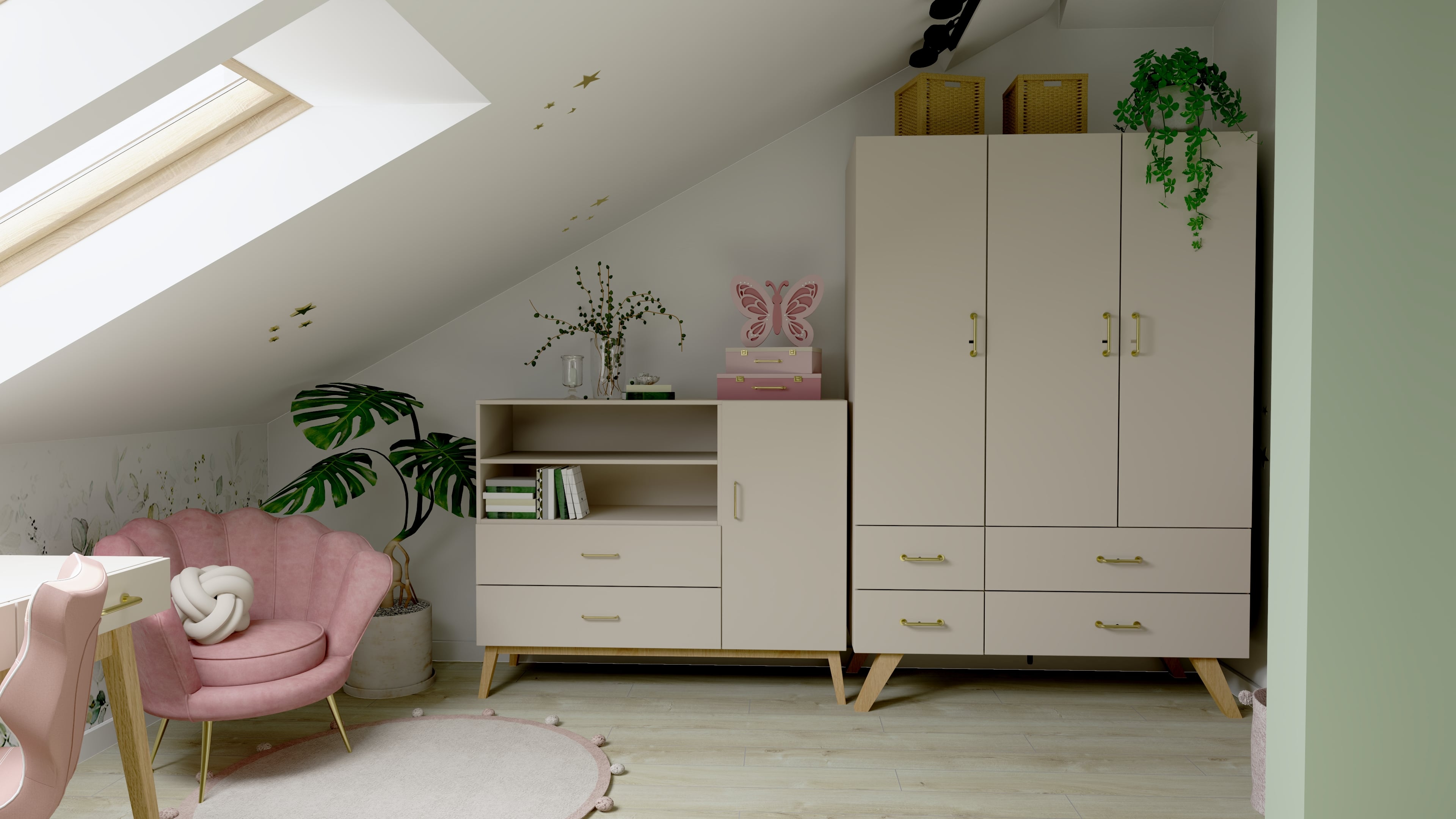 W aranżacji pokoju wykorzystano meble o łagodnych formach i pastelowych frontach, które harmonizują z kolorystyką ścian i dekoracji. Szafa, regały i komody zapewniają dużo miejsca do przechowywania ubrań, książek i zabawek, jednocześnie utrzymując porządek w pokoju. Złote uchwyty i subtelne detale dodają elegancji całemu wnętrzu.